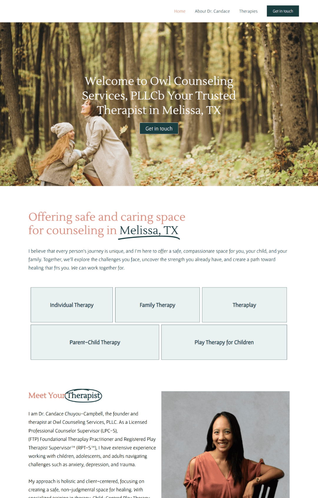 Dr. Candace Chuyou-Campbell is a Licensed Professional Counselor Supervisor and Registered Play Therapist Supervisor. We built a professional mental health website that communicates her depth of expertise — and makes it easy for families to find and book her.