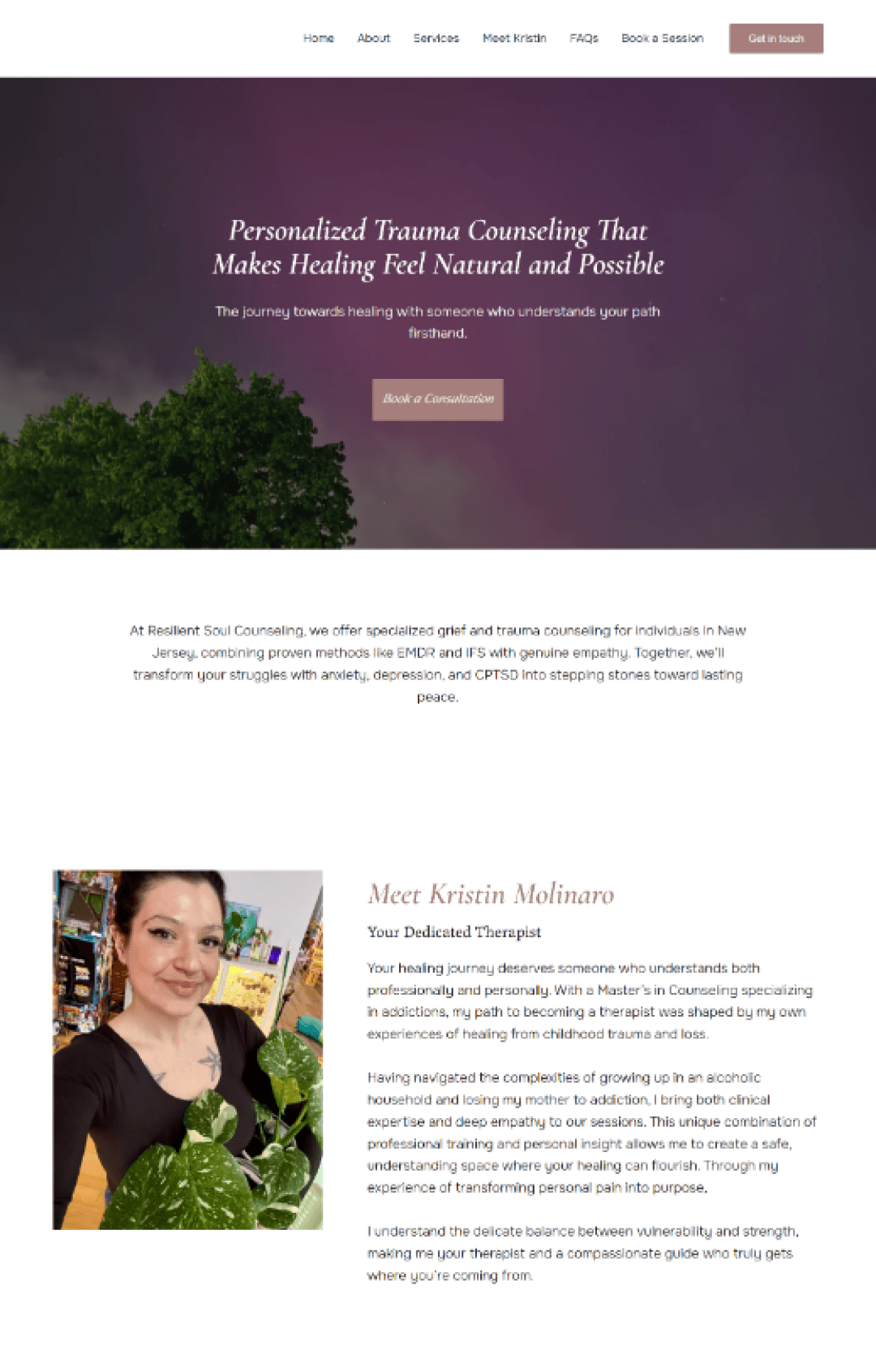 Kristin Molinaro specializes in trauma, anxiety, and depression. We built a mental health website that leads with her clients' pain points — creating an immediate connection with people who are ready to start healing.