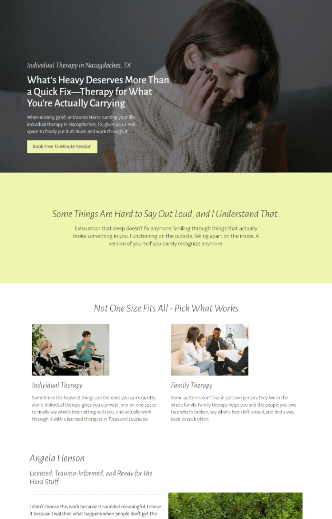 Angela Maria helps clients working through anxiety, grief, and trauma. We built a counseling website that handles both Texas and Louisiana compliance requirements — while keeping the copy warm, human, and conversion-focused.